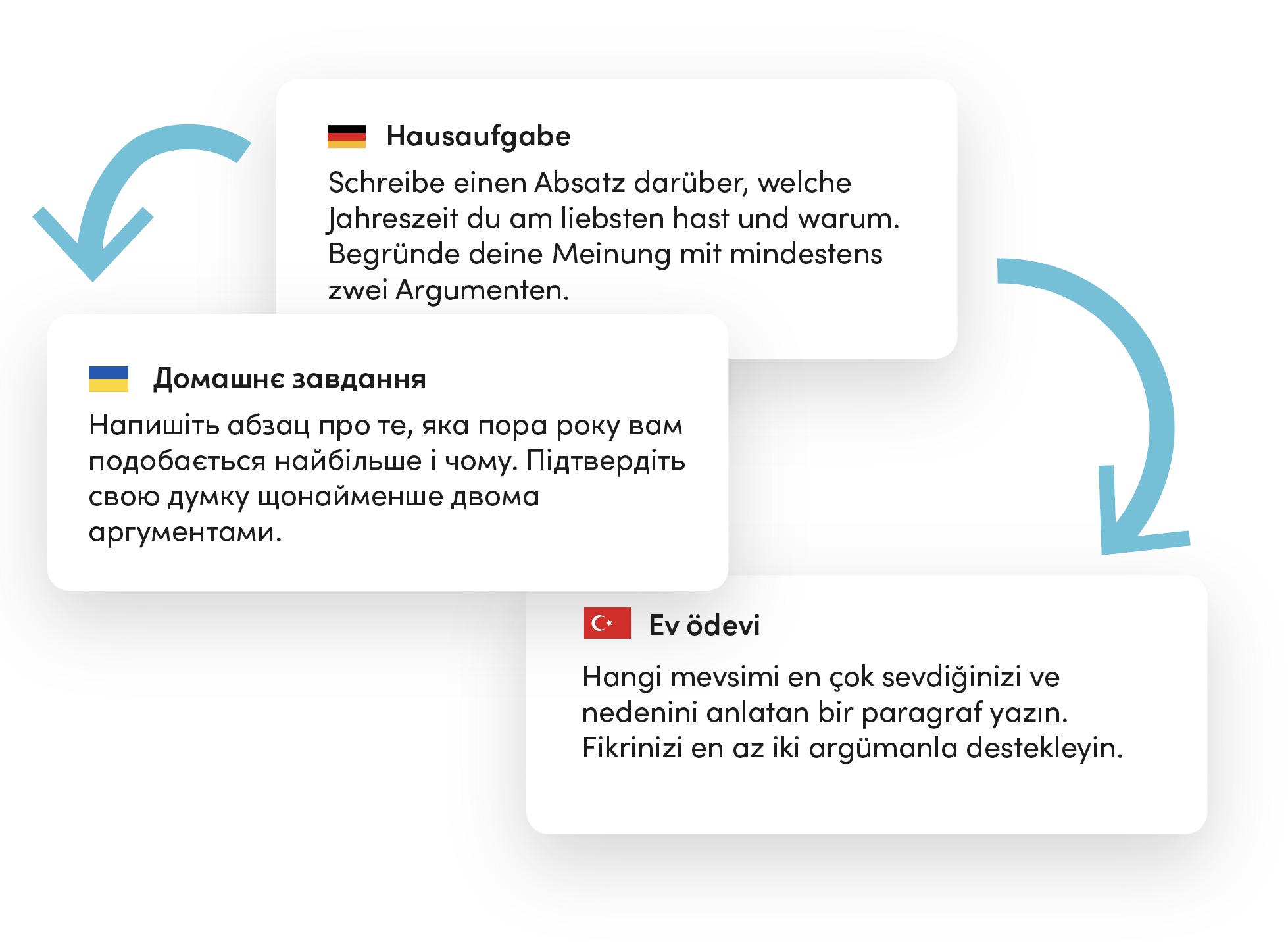 Alle textlichen Inhalte in allen SWOP Modulen können in Echtzeit in beliebige Sprachen übersetzt werden. Elternbriefe, Mitteilungen, Aufgaben, Notizen – alles sofort verständlich für Familien mit unterschiedlichen Muttersprachen.